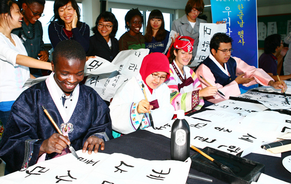 Çѱ¹¾î¸¦ ¹è¿ì´Â ¿Ü±¹ÀÎ À¯Çлýµé¿¡°Ôµµ Çѱ۳¯Àº Ưº°ÇÑ ÀǹÌ. ÇѸ²´ë ±¹Á¦À¯ÇлýµéÀÌ Çѱ۳¯À» ¸Â¾Æ 8ÀÏ ÇÑ±Û º×±Û¾¾ ¾²±â Çà»ç¸¦ °³ÃÖÇß´Ù. Çѱ¹¿¡ ´ëÇÑ »ý°¢°ú Áñ°Ü¾²´Â ÇѱÛÀ» ȼ±Áö À§¿¡ º×À¸·Î ¿Å±â°í ÇѺ¹À» ÀԾ´Â µî ÇѱÛÀÇ ¾Æ¸§´Ù¿ò°ú Çѱ¹¹®È¸¦ üÇèÇß´Ù.