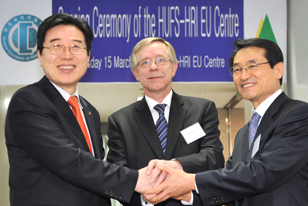 EU¼¾ÅͰ¡ 15ÀÏ Çѱ¹¿Ü´ë¿¡ ¹®À» ¿¾ú´Ù. Çѱ¹¿Ü´ë¿Í Çö´ë°æÁ¦¿¬±¸¿ø ÄÁ¼Ò½Ã¾öÀ¸·Î ±¸¼ºµÈ ¡®Çѱ¹¿Ü´ë-Çö´ë°æÁ¦¿¬±¸¿ø EU¼¾ÅÍ¡¯´Â ÀÌ ³¯ °³¼Ò½ÄÀ» ¿°í ÇâÈÄ 4³â°£ ±³À°, ¿¬±¸ ÇÁ·Î±×·¥ µî EU °ü·Ã Ȱµ¿À» ÆîÄ¡°Ô µÈ´Ù. Çѱ¹¿Ü´ë´Â EU·ÎºÎÅÍ 80¸¸ À¯·Î(¾à 12¾ï¿ø)¸¦ Áö¿ø¹Þ¾Æ ±¹Á¦È ¿ª·®¿¡ ź·ÂÀ» °¡ÇÑ´Ù´Â ±¸»óÀÌ´Ù. EU¼¾ÅÍ´Â ±¹³»ÀÇ °æ¿ì ±âÁ¸ ¿¬¼¼´ë¿Í ºÎ»ê´ë ¿Ü À̹ø Çѱ¹¿Ü´ë¿Í ¿µ³²´ë°¡ Áö¿ø ´ëÇеéÀÇ Ä¡¿ÇÑ °æÀï ³¡¿¡ ¼±Á¤µÆ´Ù. ¹Ú ö Çѱ¹¿Ü´ë ÃÑÀå, Å丶½º ÄÚÁñ·ÎÇÁ½ºÅ° ÁÖÇÑ EU´ëÇ¥ºÎ ´ë»ç, ±èÁÖÇö Çö´ë°æÁ¦¿¬±¸¿øÀåÀÌ °³¼Ò½Ä¿¡¼ ¼ÕÀ» ¸ÂÀâ¾Ò´Ù.(¿ÞÂʺÎÅÍ)